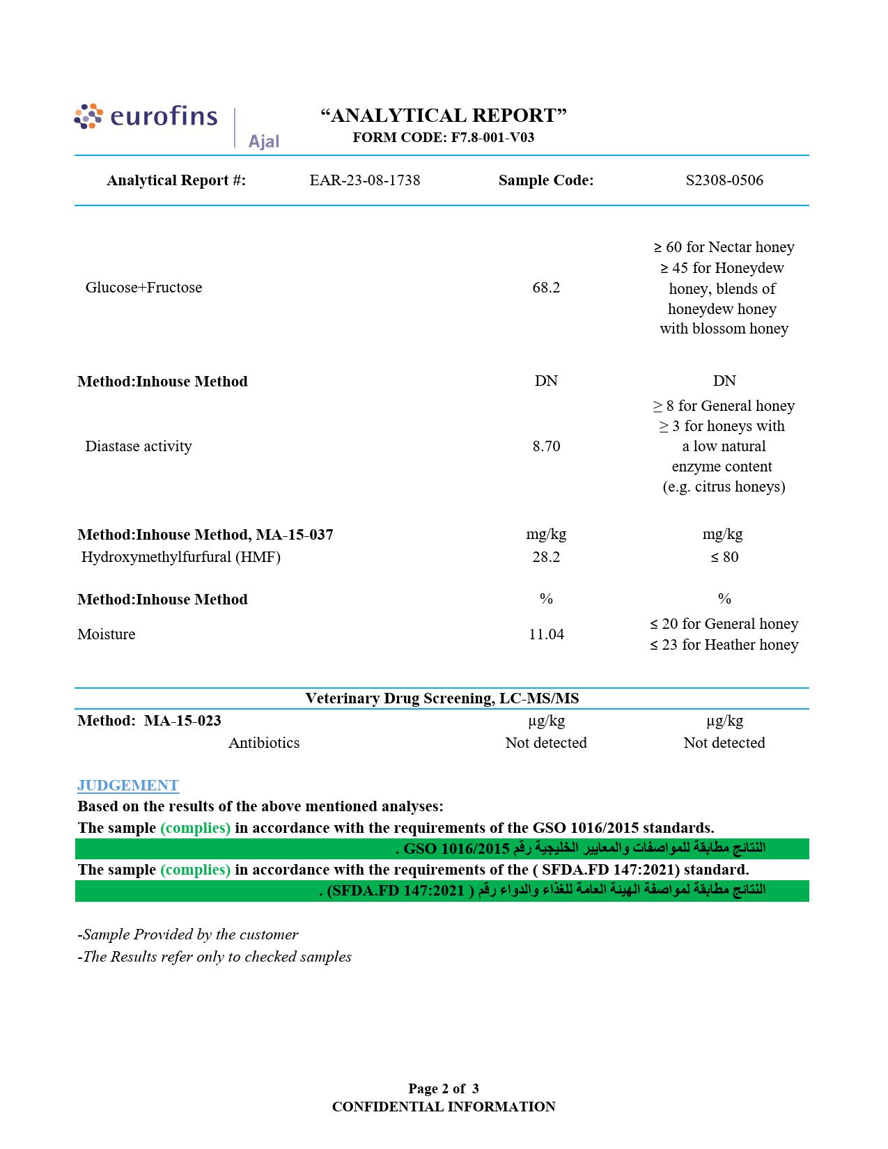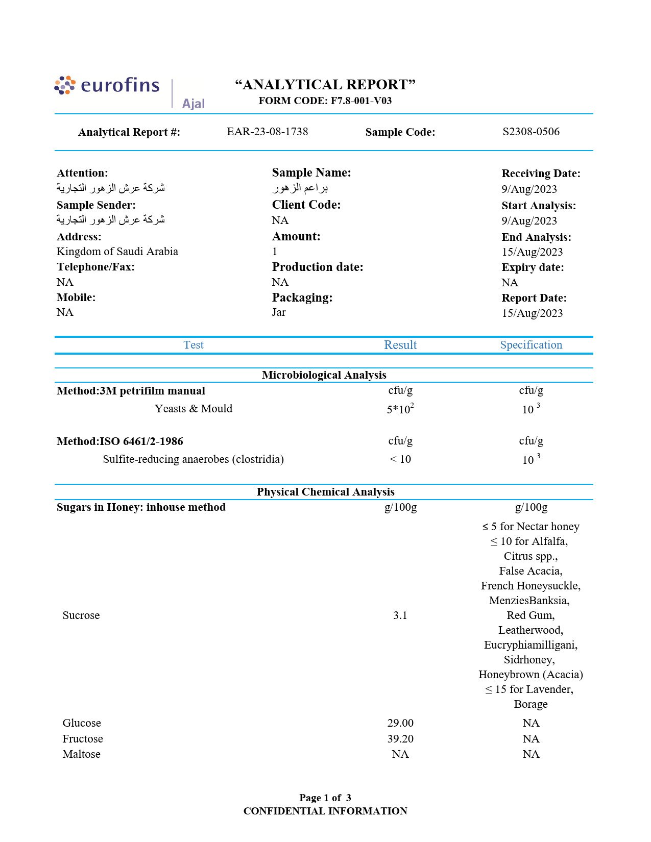 من أجل الحرص على منح الجميع قسط وفير من الاطمئنان والثقة حرصنا على فحص جميع منتجات العسل التي نوفرها بمختبرات موثوقة ومسجلة لدى هيئة الغذاء والدواء دون استخدام الطرق التقليدية, المعامل تمنحك نتيجة مؤكدة من أجل التجنب من الوقوع في مشكلة شراء منتج مغشوش لذلك أصبح لدينا سابقة اعمال كبيرة و مميزة تشهد لنا بالضمان والثقة على الدوام.